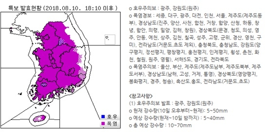 기상청은 이날 최대 70㎜의 비가 내릴 것으로 전망했다.