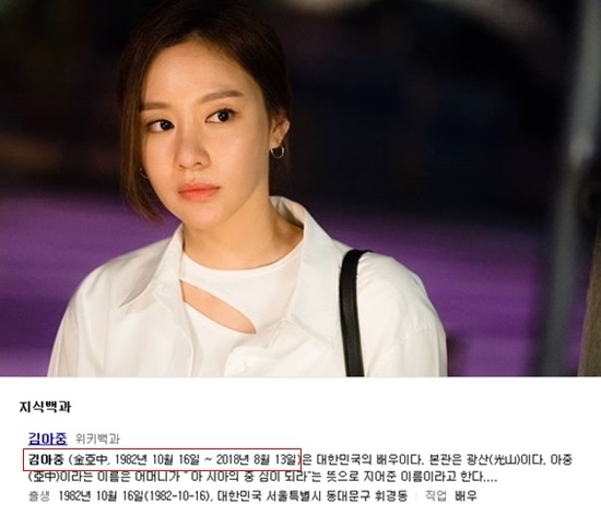 게다가 온라인 백과사전인 위키백과 정보에 김아중의 사망일이 기재되며 누리꾼들을 놀라게 했다. 위키백과 프로필상 김아중 정보는 이날 오후 2시 40분 현재 '김아중 (金亞中, 1982년 10월 16일 ~ 2018년 8월 13일)이라고 표기되고 있다.