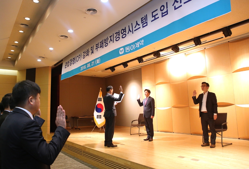 이미지 확대보기동아제약은 21일 서울 용두동 본사에서 준법경영(CP) 강화 및 부패방지경영시스템 ISO37001 도입 선포식을 가졌다고 밝혔다.