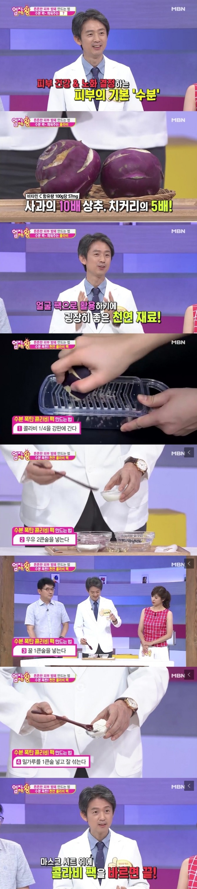 그는 여름철 폭염으로 수분을 잃은 피부에는 수분을 채우는 비법 천연 팩으로 콜라비를 추천했다. 콜라비에는 비타민C의 함량이 100g당 57mg으로 사과의 10배, 상추와 치커리의 5배가 들어있다고. 그로인해 칙칙한 피부톤을 완화시켜주고 피부 염증 완화에 도움이 되며 노화를 예방한다. 특히 콜라비에는 수분 함량이 91%로 피부에 팩을 하기에 굉장히 좋은 재료라고 강조했다.