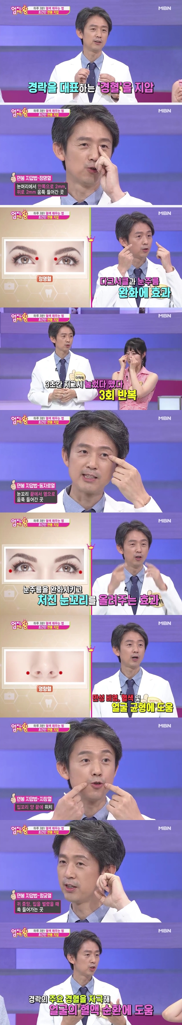 이혁재 한의사는 또 면봉으로 경혈을 지압해서 혈색을 돌게 하고 주름을 완화시키는 법을 공개했다. 그는 "경락을 대표하는 주요 경혈을 자극해 얼굴의 혈액순환에 도움을 준다. 생각보다 효과가 좋다"고 강조했다.