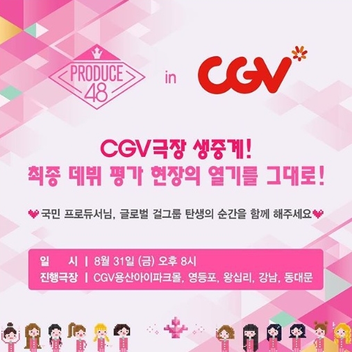 '프로듀스 48' 최종회를 생중계하는 CGV극장은 용산아이파크몰, 영등포, 왕십리, 강남, 동대문 등 5곳이다. 티켓 예매는 CGV 홈페이지를 통해 진행된다.