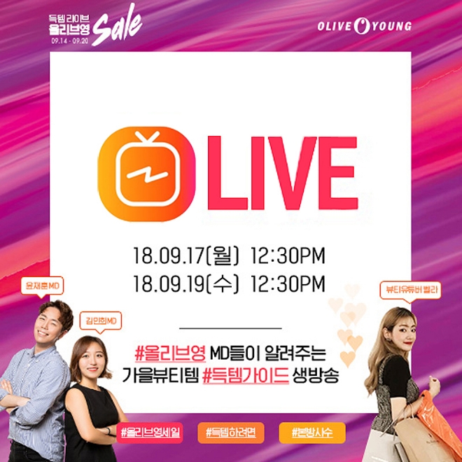 올리브영은 이번 모바일 생방송을 통해 재미와 소통이라는 두 마리 토끼를 잡겠다는 포부다. 17일과 19일 양일간 올리브영 상품기획자(MD)가 직접 출연해 올가을 트렌드와 세일 기간 놓쳐서는 안될 제품을 소개하는 등 고객들에 색다른 쇼핑의 재미를 제공할 계획이다.