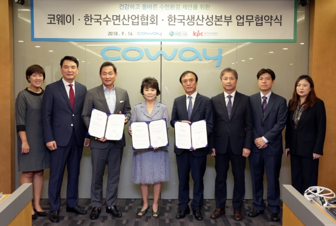 이미지 확대보기코웨이는 지난 14일 서울 중구 코웨이 본사에서 한국수면산업협회 및 한국생산성본부와 ‘건강하고 올바른 수면환경 제안’을 위한 업무협약을 체결했다고 밝혔다. 이번 업무협약은 코웨이 위생관리 전문가인 ‘홈케어닥터’의 서비스 전문성 강화를 통해 최적의 숙면 솔루션을 제공하고자 마련됐다.
