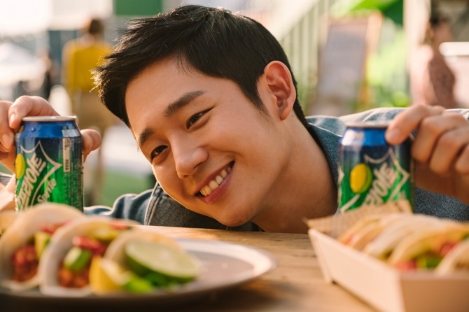공개된 광고 촬영장 비하인드 컷에서 정해인은 먹음직스럽게 요리된 음식과 스프라이트의 ‘케미’에 ‘맛있는 미소’를 선보이고 있다.