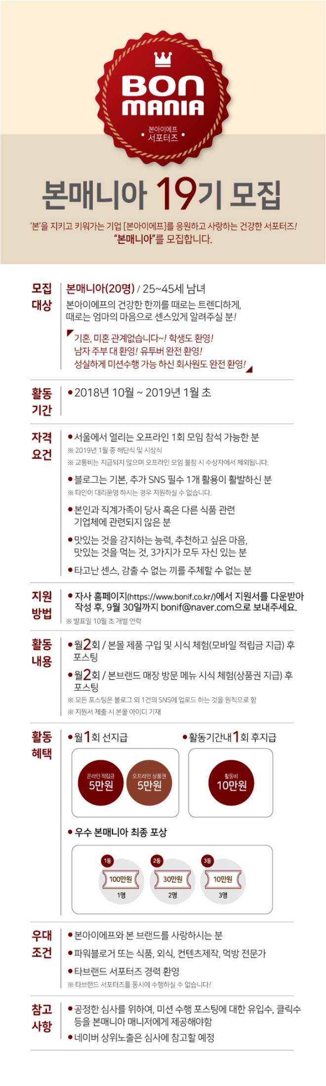 올해로 19번째를 맞이한 본아이에프의 공식 서포터즈 '본매니아'는 건강한 한 끼를 감각적으로 제안할 수 있는 25세부터 45세까지의 남녀라면 누구나 지원할 수 있다. 본매니아 19기로 선발되면 다음달부터 내년 1월 초까지 약 3개월간 본아이에프의 공식 온라인 홍보대사로 활동하게 된다.