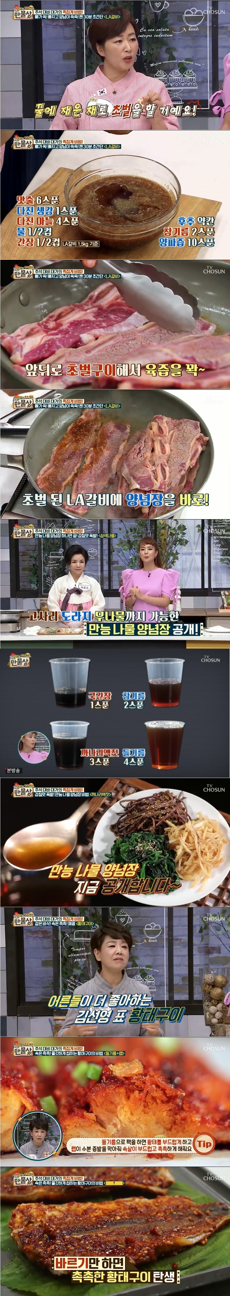 이미지 확대보기지난 20일 방송된 TV SCHOSUN '살림9단의 만물상' 261회에서는 '추석 대비 대가의 족집게 비법' 특집으로 조영신 조리기능장, 박효순 종갓집 종부, 김선영 조리기능장이 출연, 추석 명절 음식으로 만능나물양념장, 삼색전, 삼색나물 무침, 돼지갈비찜, LA갈비, 매콤 황태구이, 오징어초무침 만드는 법을 공개했다.