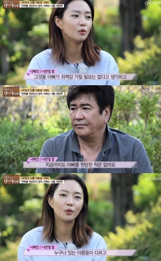 나혜진은 "재혼은 아빠의 선택"이라며 "아빠가 죄책감 가질 필요가 없다고 생각한다. 아빠를 원망한 적 없다"고 말했다.