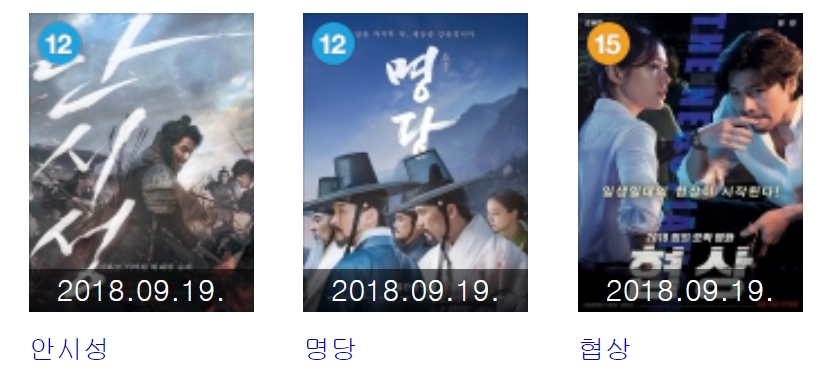 특히 19일 동시에 개봉한 한국영화, '안시성', '명당', '협상' 등이 순차적으로 100만 관객을 동원하며 흥행몰이 중이다.
