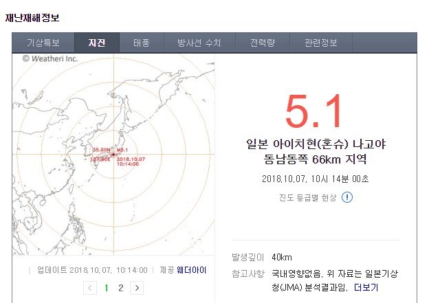 7일 오전 10시14분 일본 아이치현(혼슈) 나고야 동남동쪽 66km 지역에서 5.1로 추정되는 지진이 발생했다고 일본 기상청이 밝혔다.