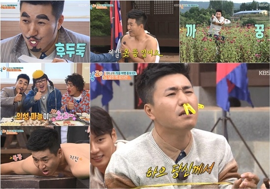 이날 KBS 2TV '해피선데이-1박 2일 시즌3'(이하 '1박 2일')는 경상북도 의성과 군위로 떠난 '가을 여행 홍보 CF' 첫 번째 이야기가 펼쳐져 시종일관 빵빵 터지는 웃음으로 시청자들의 시선을 강탈했다. 이날 김종민은 사생대회에서부터 하드캐리를 발산했다. 시작부터 깍듯한 90도 인사로 예의 바른 신바(신나는 바보)의 매력을 어필한 그는 가을을 맞아 백일홍을 주제로 한 100일홍 시로 초등학생 심사위원을 마음을 단단히 사로잡았다.