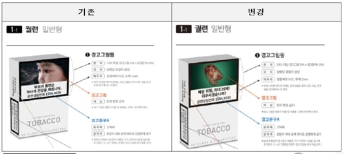 이미지 확대보기15일 보건복지부에 따르면 연말에 새로 부착될 담뱃갑 경고그림 및 문구를 담배 제조·수입업자가 제대로 표기할 수 있도록 표기 매뉴얼을 배포한다. 흡연 경고 그림은 2016년 12월 23일 흡연 경고그림 정책을 도입했다. 2년에 한 번씩 경고그림과 문구를 교체하는데, 현재 쓰이고 있는 11종의 경고그림(궐련류 10종, 전자담배용 1종)은 모두 새로운 그림으로 교체된다.