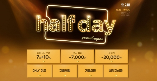 하프데이 행사의 대표상품으로는 헤지스, 탱커스, 비엔엑스 등 남녀 캐주얼 브랜드가 니트, 경량 패딩 제품에 대해 추가 쿠폰할인 혜택을 제공한다. 질스튜어트와 모그핑크는 코트, 패딩, 퍼와 같은 F/W 아우터를 85%까지 세일하고, 티엔지티(TNGT)와 질스튜어트뉴욕은 남성용 니트를 1만원대, 울코트를 9만원대로 판매한다.