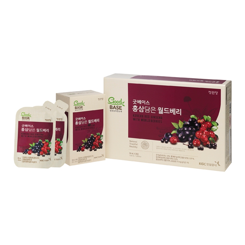 이미지 확대보기‘홍삼담은 월드베리’는 세계 유명 산지에서 자란 아사이베리·링곤베리·엘더베리와 정관장 6년근 홍삼농축액을 더한 제품이다. 설탕·색소·합성향료를 넣지 않은 제품으로 자연의 건강한 맛을 느낄 수 있으며, 파우치로 포장되어 언제 어디서나 간편하게 섭취 가능하다.