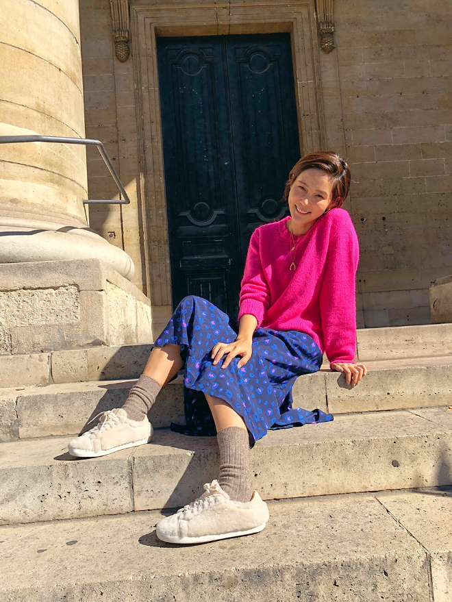 프렌치 감성 컨템포러리 브랜드 바네사브루노아떼는 간결하지만 최신 트렌드가 가미된 데일리 슈즈 라인을 주력으로 선보인다. 화보 속 김나영은 생생한 색감이 드러나는 핑크 니트, 블루 스커트에 풍성한 양털 소재 스니커즈를 매치해 편안하고 자연스러운 멋을 표현했으며, 보라색 롱 원피스에 그레이 색상의 감각적인 스웨이드 부츠를 코디해 꾸민 듯 꾸미지 않은 듯한 세련된 스타일을 연출했다.