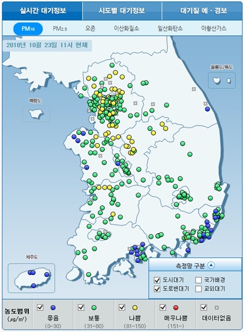환경부 대기환경정보 에어코리아에 따르면, 이날 오전 11시 기준 전국에서 황사는 나타나지 않고 있다.
