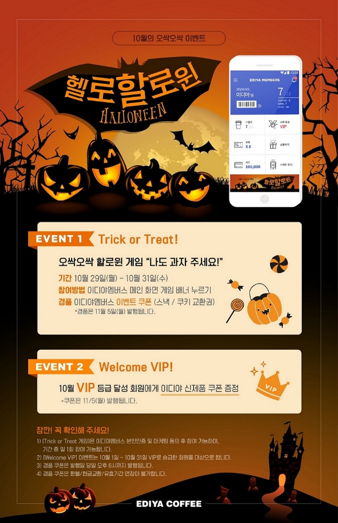 이미지 확대보기이디야커피는 오는 31일 할로윈데이를 맞아 멤버십 어플리케이션 ‘이디야멤버스(EDIYA MEMBERS)’ 을 통해 '헬로 할로윈' 게임 이벤트를 진행한다고 밝혔다. 이벤트는 ‘이디야멤버스’ 메인 화면 속 ‘헬로 할로윈’ 게임 배너를 통해 진행되며, 이디야 멤버스 회원이라면 하루에 한 번씩 누구나 참여 할 수 있다.