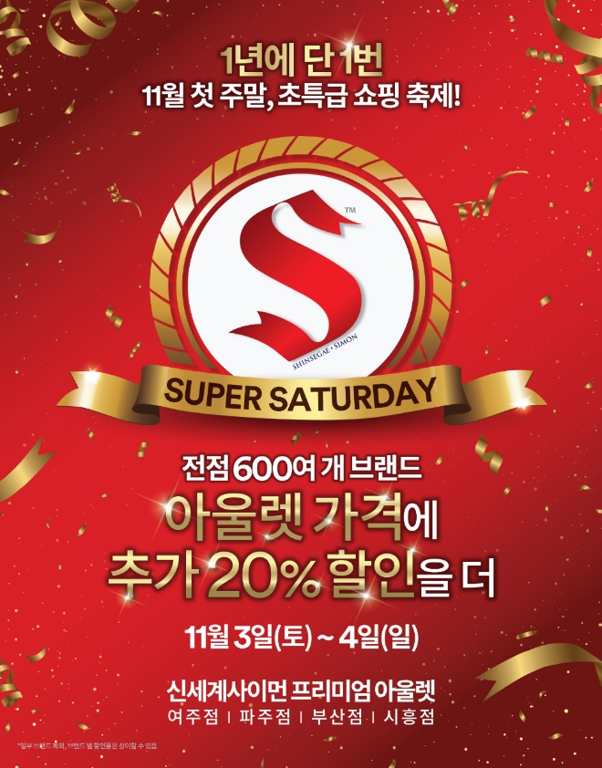 브랜드 할인 혜택과 함께 제공되는 다양한 사은행사와 현장 이벤트로 ‘수퍼 새터데이’가 개최되는 양일간 신세계사이먼 프리미엄 아울렛은 화려하고 즐거운 축제의 장이 될 전망이다.