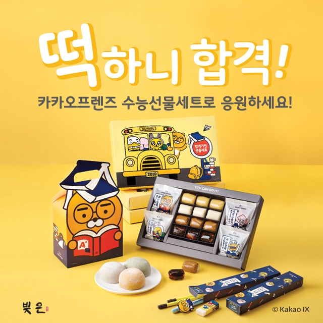 이미지 확대보기먼저, 카카오IX의 인기 캐릭터 브랜드 ‘카카오프렌즈’와 함께한 ‘떡하니 합격 선물세트’를 선보였다. ‘떡하니 합격 선물세트’는 팥, 호박, 고구마, 쑥 등 4가지 맛의 찹쌀떡 8개로 구성된 1호와 찹쌀떡과 전통엿(땅콩, 호박, 생강 등)이 함께 구성된 2호, 찹쌀떡과 전통엿 외에 ‘카카오프렌즈’ 필기구(정답만 찍는 사인펜, 집중력 200% 볼펜, 술술 풀리는 연필 등 4종)가 포함된 3호까지 총 3종이다.