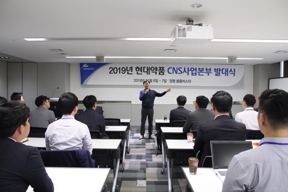 [글로벌이코노믹 한아름 기자] 중추신경계질환 치료제시장이 지속적으로 확대되고 있는 가운데 현대약품이 7일 CNS 사업본부조직 확대·재구성을 위한 발대식을 진행했다. 현대약품은 차별화되고 집중화된 전략을 통해 CNS 영역에서 고객수요를 충족시키고 선도그룹에 진입하기 위해 CNS 사업본부 조직에 변화를 줬다고 밝혔다.2000년~2017년 미국식품의약국(FDA)의 허가를 취득한 신약·생물의약품 509개 중 중추신경계 치료제는 57개에 불과하다. 따라서 CNS 치료제 개발은 상대적으로 어렵고 기간도 긴 것으로 알려졌다. 이러한 상황에도 불구하고 현대약품은 2018년 IMS Data 기준 CNS 품목이 전년 대비 성장률 34%를 기록하며 CNS 영역에서 가장 높은 성장률을 기록했다.