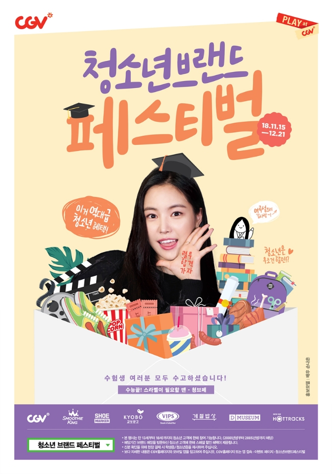 이미지 확대보기CGV는 오는 15일부터 다음달 21일까지 수능 수험생과 청소년들이 좋아할만한 다양한 브랜드의 혜택을 모아 ‘청소년 브랜드 페스티벌’을 개최한다고 밝혔다. 이번 페스티벌에는 CGV를 비롯해 핫트랙스, 스무디킹, 슈마커, 교보문고, 디뮤지엄, 빕스, 계절밥상 총 8개 브랜드가 참여한다. 만 13세부터 18세까지의 청소년이라면 누구나 참여 가능하며, 각 브랜드 매장에서 학생증 또는 청소년증을 제시하면 된다.
