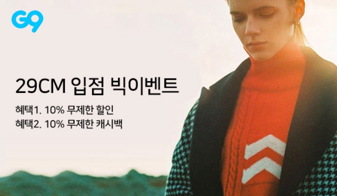 G9는 이번 공식 입점을 기념해 할인 한도에 제한이 없는 무제한 10% 할인 프로모션을 진행한다. 또한, 프로모션 기간 내 29CM 제품을 구입한 고객에게 구매 가격의 10%에 해당하는 추가 캐시백 혜택도 함께 제공한다. 추가 캐시백 역시 한도 제한 없이 무제한으로 지급받을 수 있다.