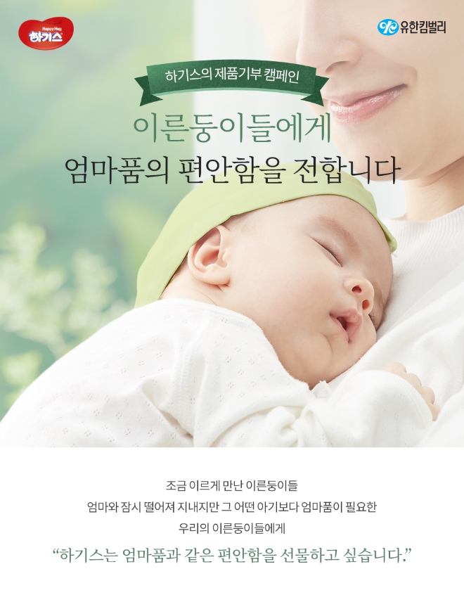 유한킴벌리는 유아용품 1위 기업의 사회적 책임을 다하고, 이른둥이에 대한 사회적 관심과 배려를 확산하기 위한 목적으로 2017년 ‘이른둥이 캠페인’과 함께 이른둥이용 기저귀를 무상 지원하기 시작했다.