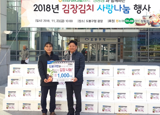 농협하나로마트 창동점 김주학 지사장과 창동 하나로 봉사단은 도봉구청에서 관내 소년소녀 가장, 조손가정, 독거 어르신 등 김장을 담그기 어려운 저소득층 및 취약계층을 위해 따뜻한 겨울을 날 수 있도록 믿을 수 있는 우리 농산물로 담근 김장김치 1000㎏을 기부하는 행사를 실시했다.