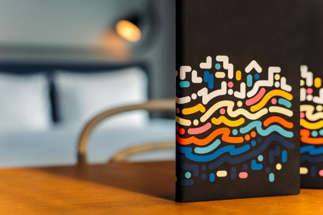 L7 x YNHP 다이어리는 글로벌 도시의 특징을 재해석하는 윤협의 작품관과 L7호텔이 위치한 서울의 역동적인 모습을 담아냈다. 다이어리 커버는 ‘잠들지 않는 서울의 빛과 리듬’을 주제로 도심 속 수많은 빛이 어둠을 밝히며 도시를 수놓는 모습을 추상화해 디자인했다.