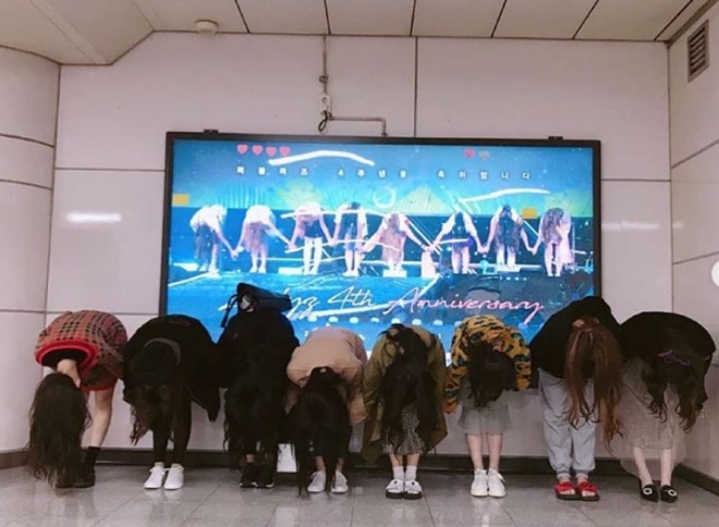 공개된 사진 속 그들은 팬들이 선물해준 전광판 앞에서 포즈를 취하거나 전광판과 같은 모습으로 손잡고 90도 인사를 하고 있다.