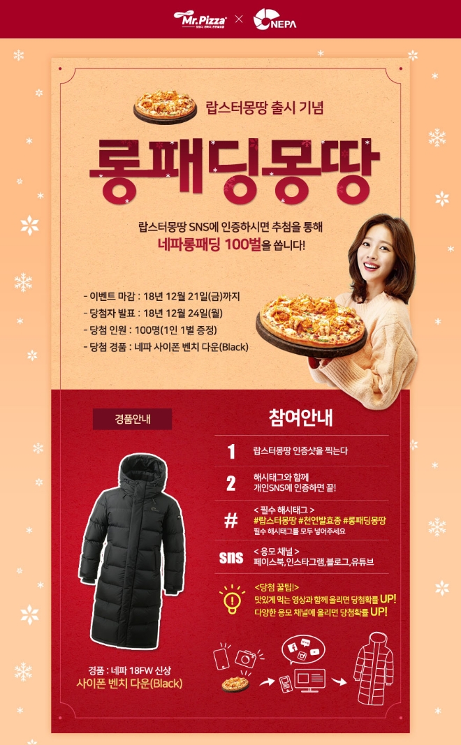 이미지 확대보기다음달 21일까지 ‘롱패딩몽땅’ 인증샷 프로모션을 통해 총 100명에게 2018년 신상품 네파 사이폰 벤치다운 (35만원 상당 롱패딩)을 증정한다. 개인 SNS(인스타그램, 페이스북, 유튜브, 블로그)에 랍스터몽땅 피자와 #랍스터몽땅 #천연발효종 #롱패딩몽땅 등의 필수 해시태그를 업로드 하면 응모 가능하다.
