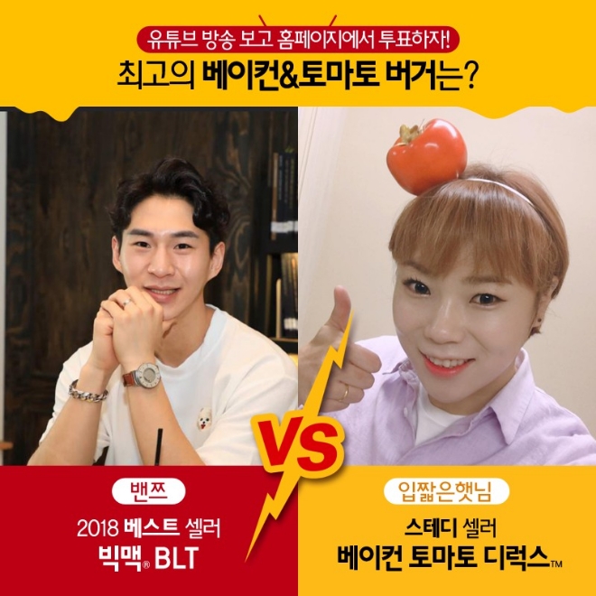 29일 오후 8시 30분부터 9시 30분까지 1시간 가량 진행되는 라이브 방송에서 밴쯔는 ‘빅맥BLT’, 입짧은 햇님은 ‘베이컨 토마토 디럭스’를 대표해 각자 선호하는 제품이 최고의 베이컨&토마토 버거로 뽑혀야 할 이유를 각양각색으로 어필한다.