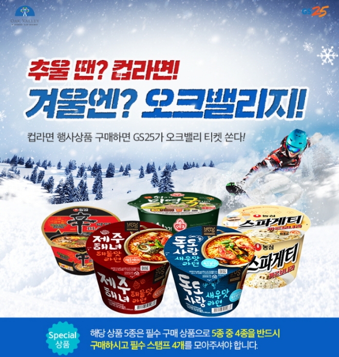 행사 용기면(컵라면) 구매하고 스탬프 7개 모으면 오크밸리 숙박권과 리프트권이 제공된다. 1등 주중 숙박권(200개), 2등 주간 리프트권(6000개), 3등 오후 리프트권(2만개), 4등 오전 리프트권(7만개)이 준비돼 있다.