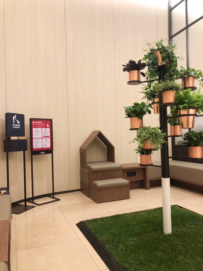 일반인과 반려견 동반 고객들이 따로 편하게 쉴 수 있도록 불투명 유리벽을 활용해 공간을 분리시켜 각각의 고객들이 편하게 쉴 수 있도록 배려했다. 또 반려견이 올라가 쉴 수 있는 집 형태의 애견 전용 소파를 비롯해, 반려견의 행동 패턴을 고려해 용변을 해결할 수 있는 천연잔디와 천연목재 기둥으로 구성된 반려견 전용 해우소도 설치했다.