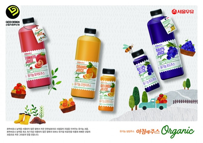 올해 포장 식·음료부문 ‘우수디자인(GD, GOOD DESIGN)’으로 선정된 서울우유 ‘아침에주스’는 올드한 이미지에서 벗어나 보다 새로운 감성의 주스 라인으로 개발하고자 여성 일러스트 작가와의 콜라보를 통해 젊고 감각 있는 패키지로 탄생했다. 일러스트로 표현된 패키지디자인은 순수한 제품 속성 가치를 느끼게 하며, 라벨 후면의 이음 부분에 나무 모양 절개로 자연의 맑고 청량함을 느낄 수 있도록 연출한 것이 특징이다. 또한 플라스틱 용기의 재활용률을 높이기 위해 물과 접촉 시 접착력이 사라져 쉽게 분리되는 친환경 라벨을 적용했다.