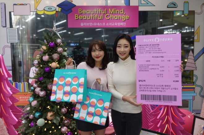 이미지 확대보기CJ올리브네트웍스가 운영는 올리브영은 연말을 맞아 개발도상국 소녀들의 핑크빛 미래를 응원하는 ‘핑크영수증’을 발행하고 12일부터 오는 18일까지 ‘유네스코 소녀교육’ 캠페인을 전개한다고 밝혔다.