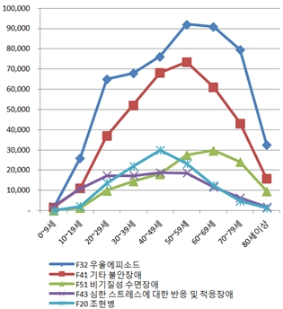 0~9세는 운동과다장애와 함께 말하기·언어의 발달장애가 두드러졌고, 10대부터 우울·불안·심한 스트레스에 대한 적응장애가 증가하면서 20대에 전연령 가운데 가장 큰 폭으로 우울·불안 환자수가 늘어났다.
