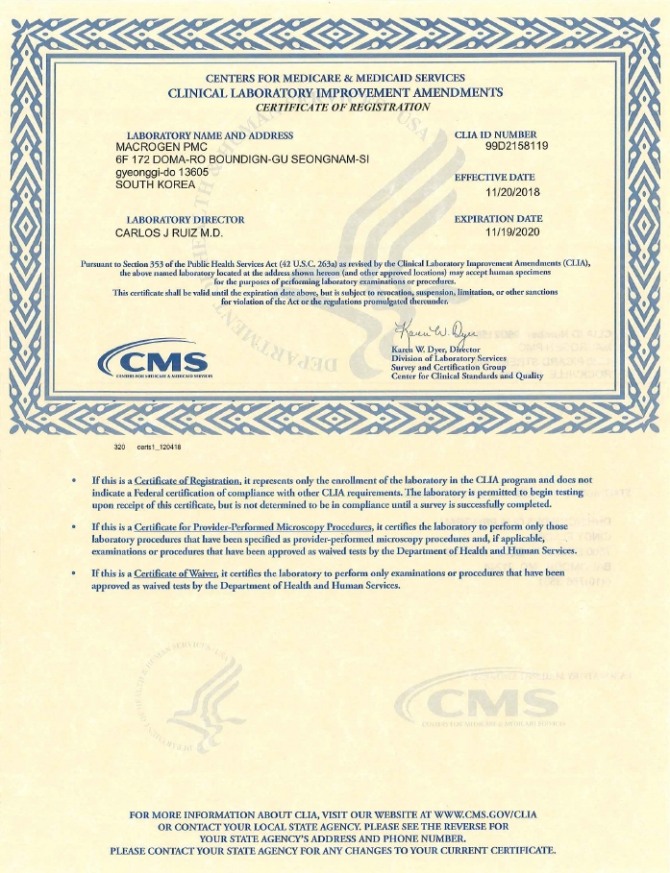 마크로젠 본사와 분당 정밀의학센터는 지난 8월 CAP(미국병리학회) 인증을 받은 데 이어 이번에 CLIA 인증을 획득하는 쾌거를 이뤘다.