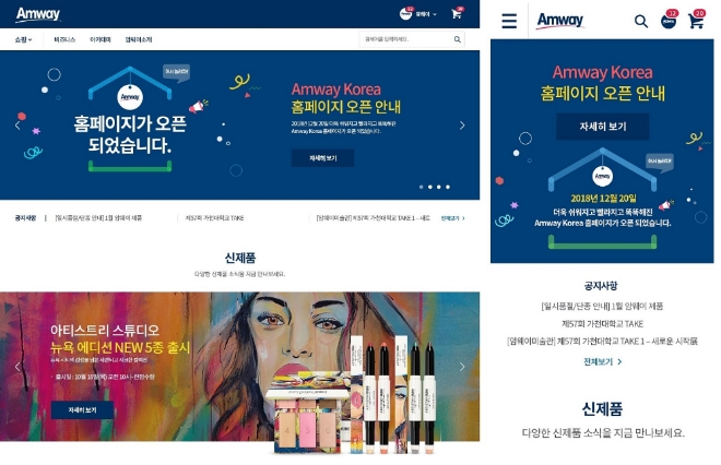 이미지 확대보기한국암웨이는 공식 홈페이지 리뉴얼 작업을 마치고 20일 새로 오픈한다고 밝혔다. 개편된 홈페이지는 한국암웨이의 기존 온라인 쇼핑몰 사이트와 통합된 형태로 구축됐다. 뉴트리라이트, 아티스트리 등 암웨이 주요 브랜드 사이트 또한 흡수해 접근성을 높였다.