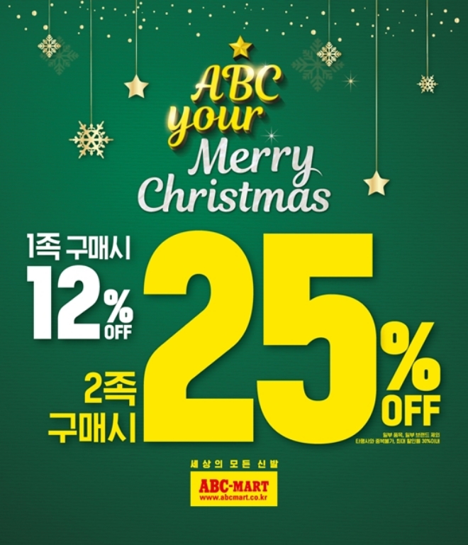 이미지 확대보기ABC마트는 크리스마스 시즌을 맞아 오는 25일까지 ‘ABC Your Merry Christmas’ 행사를 실시한다고 밝혔다. 행사 기간 동안 신상품을 포함해 신발 1족 구매 시 12%, 2족 구매 시 25%의 특별한 할인 혜택을 제공한다.
