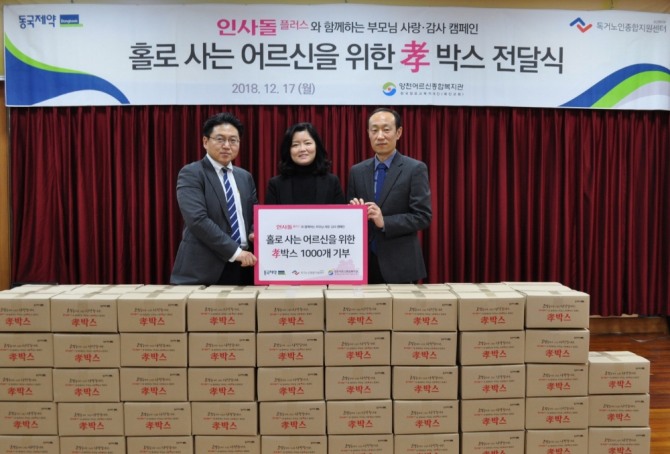 동국제약은 지난 9월 구강암 환자를 돕기 위한 ‘스마일 런 페스티벌’과 한국의약품유통협회와 MBC나눔이 공동 주관한 ‘헬스케어 마켓’에서, ‘부모님 사랑.감사 캠페인’을 진행했다. 이 행사에 동참한 일반인들이 하트 모양의 스티커를 부착하면, 그 수량만큼 '효 박스'를 적립하는 ‘사랑의 온도계’ 이벤트를 진행해 1000개의 물품을 마련했다.