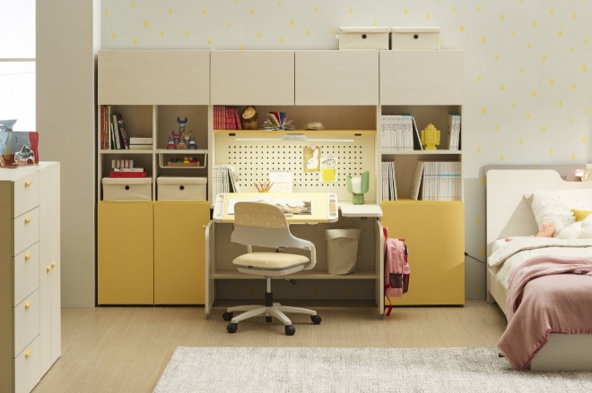 새로 출시한 낮은 수납장 역시 좁은 자녀방을 다양하게 활용할 수 있도록 해준다. 단독 책상 두 개 사이에 낮은 수납장을 배치하면 두 자녀가 함께 학습할 수 있고, 책상과 침대 사이에 두면 수면영역과 학습영역을 구획 지을 수 있다.
