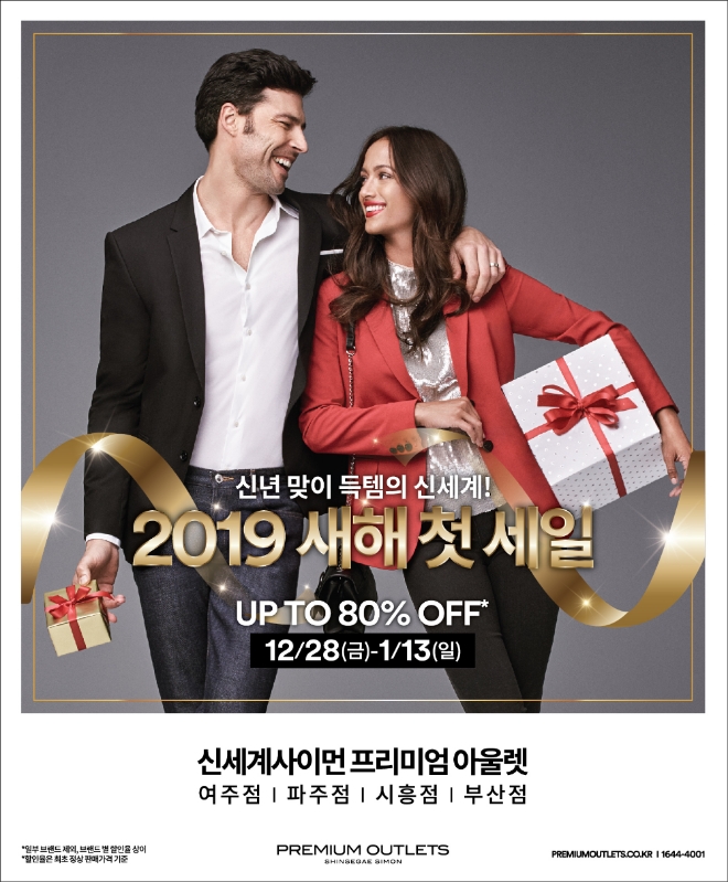 신세계사이먼 프리미엄 아울렛은 오는 28일부터 1월 13일까지 ‘2019 새해 첫 세일’을 개최한다고 밝혔다. 여주·파주·시흥·부산 프리미엄 아울렛에서 동시에 진행하는 이번 프로모션에서는 국내외 인기 브랜드의 다양한 겨울 의류와 패션 잡화를 최초 정상 판매가 대비 최고 80% 할인 판매할 예정이다.