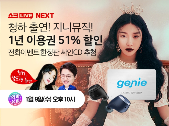 이날 방송에서는 '지니뮤직 스마트폰 전용 스트리밍 이용권(360일)과 누 포스(nu force) 블루투스 이어폰' 구성을 51% 할인한 10만6900원에, '지니뮤직 스마트폰 전용 스트리밍 이용권(360일) 단일상품'은 26% 할인한 7만1900원에 판매한다. 채팅창을 통해 구매를 인증한 고객 10명을 추첨해 청하의 신곡 싸인 CD를 증정한다.