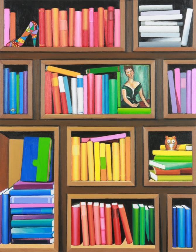 <화가의 서가(書架)>는 쓸쓸하고 애잔하게 삶의 고민을 짊어진 듯한 기다란 목과 동자 없는 눈을 가진 모딜리아니 화집의 여인이 등장한다. 그녀들을 화가의 서가로 초대해 많은 책들을 읽게 하고 그 속에서 그녀들의 고민을 해결해 주고 싶은 화가의 심정이 드러난다. 지혜의 상징인 부엉이를 책장에 두어 화가의 서가를 구경하는 이들에게 삶의 지혜를 선물하고 있다. 다양한 색상의 책들이 서고 누우면서, 고름과 흐트러짐, 높고 낮은 높이의 조화를 이루고 있다.