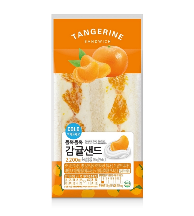 이미지 확대보기세븐일레븐이 겨울 대표 제철 과일인 감귤을 활용한 디저트 샌드위치 '듬뿍듬뿍 감귤샌드(2200원)'를 출시했다고 15일 밝혔다. '듬뿍듬뿍 감귤샌드'는 지난달 출시한 딸기샌드 인기에 힘입어 선보이는 상품이다. 과즙이 풍부하고 당도가 높은 감귤과 커스터드 생크림을 식빵 안에 듬뿍 토핑해 입 안 가득 감귤의 새콤달콤함을 느낄 수 있다.