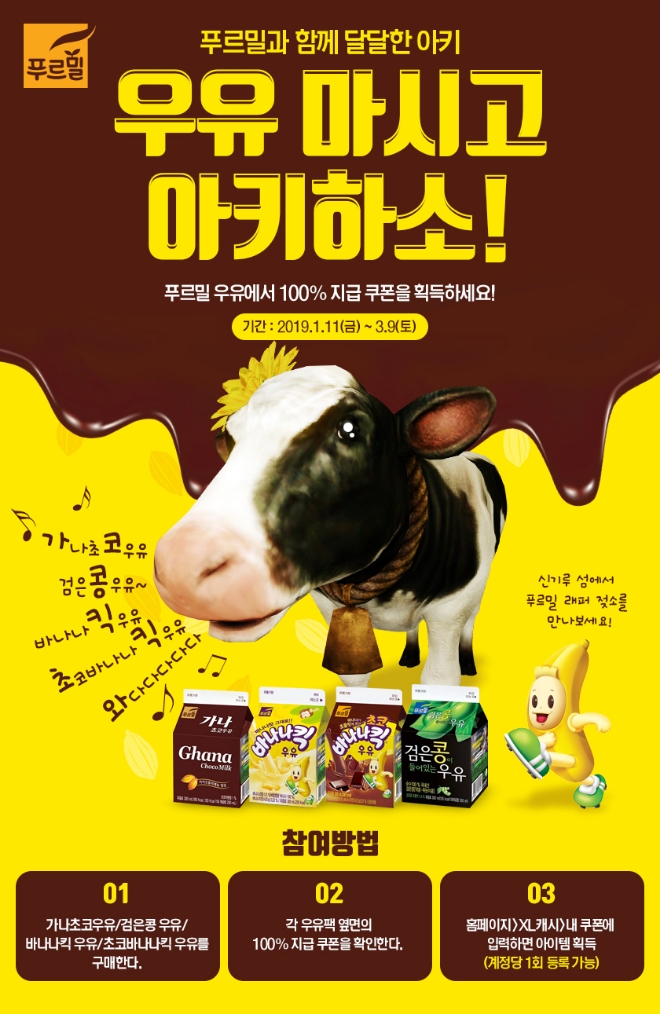 이벤트 대상 제품은 푸르밀 가나 초코우유(300㎖)와 검은콩이 들어있는 우유(300㎖), 바나나킥우유(300㎖), 초코 바나나킥우유(300㎖) 총 4종이며, 전국 주요 편의점에서 만나볼 수 있다.