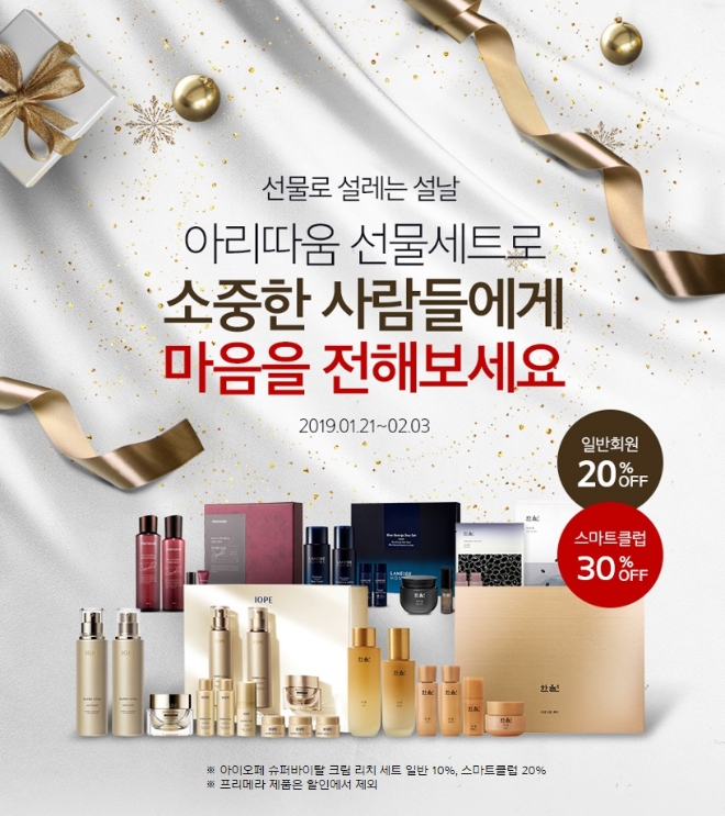 고객들이 실속 있는 설 선물을 준비할 수 있도록 행사 기간 중에는 일반회원 최대 20%, 스마트 클럽회원 최대 30%의 할인 혜택까지 제공한다. 아리따움은 고객들이 선물 선택의 고민을 덜고 상황에 따라 맞춤형으로 구매할 수 있도록 카테고리 별로 브랜드를 나눠 선물 세트를 추천한다.