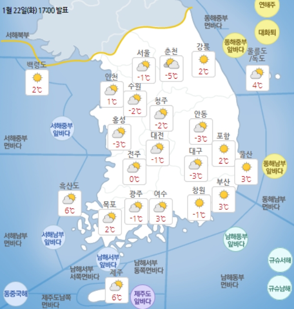 내일밤부터는 북서쪽에서 찬바람이 유입돼 모레(24일) 아침은 내일보다 기온이 4도 이상 떨어지면서 춥겠다. 중부 내륙을 중심으로 아침 기온이 영하 10도 이하로 떨어지는 곳이 있겠고 일부 경기 북부와 강원 영서에는 한파 특보가 발표될 가능성도 있으니 수도권 동파 예방 등에 각별히 조심해야 하겠다.