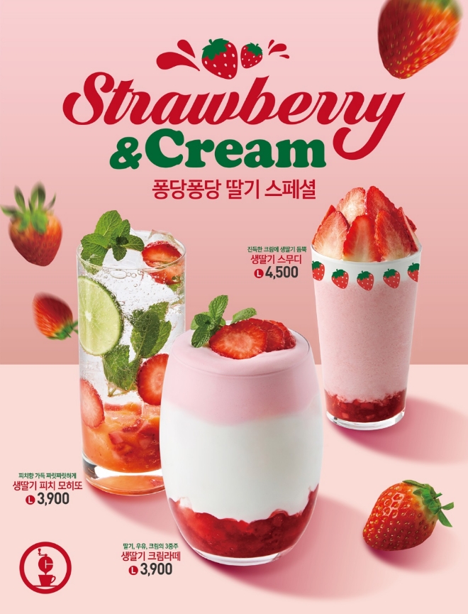 신메뉴는 딸기 과육과 우유에 딸기 크림을 얹은 ‘생딸기 크림라떼’, 딸기와 복숭아 과육의 비주얼을 살린 ‘생딸기 피치 모히또’, 딸기우유 스무디에 생딸기 토핑을 올린 ‘생딸기 스무디’다. 이번 스페셜 메뉴는 신선한 딸기를 아낌없이 넣어 상큼한 과육을 마음껏 즐길 수 있다.